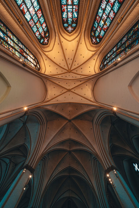 Diese Collage historischer Schichten aus sieben Jahrhunderten versteckt viele überraschende Orte. Im Sakristei-Anbau von 1438 findet sich ein prachtvoll dekorierter „Herrensaal“ mit Wappenwänden und barbusigen Tugenden an der Decke. Im südlichen Turmjoch ist eine Restaurierungswerkstatt untergebracht, die wie eine mittelalterliche Bauhütte erscheint. Und die Rekonstruktion des alten Kirchengewölbes nach dem Krieg hat über der Decke eine bizarre Landschaft von verschnürten Betoneiern unter dem leeren hohen Spitzdach hinterlassen, die wie ein Monumentalkunstwerk wirkt, obwohl es nie zur Ansicht bestimmt war. Die 1255 als Pilgerkapelle außerhalb der Stadtmauer gegründete Kirche besitzt also auch 2021 noch die Anziehungskraft des Außerirdischen. Hinpilgern lohnt.