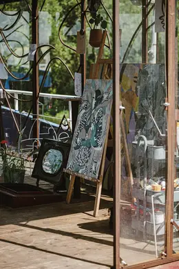 Auf der Werkbank schwere Schraubzwingen für die Skulpturen: Nik entwirft, entlehnt an antike Architekturen, himmelweite Werke aus Armierungsstahl, die Bögen im Raum nur strichhaft angedeutet, und das am liebsten in Dimensionen, die von Menschen begehbar sind. Auch setzt er Pias Motive als kalt gebogene Skulpturen um, dort hinten, wo die Bohnen ranken, zum Beispiel die „weinende Sonne“. Stets bereit auch die Metallbandsäge für die Rahmen und Holzgrundflächen der Gemälde, Schweißgerät und Werkzeug für alles, was man so mal eben für den laufenden Bootsbetrieb braucht. Und eine beinahe schon antike Lampe, die, wie unsere Fotografin Uta gleich erkennt, einst in Dunkelkammern Negative vergrößert in Positive umwandelte. Restauriert im Einsatz zur bunten Bespielung bei Ausstellungen an Bord. Dazu steht im gemütlichen Frachtraum ein amtliches DJ-Set mit Plattensammlung für Partys bereit. Wohin „Salon Walter“ Pia und Nik wohl noch trägt? Entlang der Elbe haben sie den ersten Stürmen erfolgreich getrotzt. „Walter“ hat Lust auf die Ostsee und ihre sonnenbeschienenen Buchten.