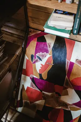 Nun sitzen wir hier, auf dem blauen Samtsofa, es duftet nach Kaffee, der wie von Zauberhand durch eine Klappe im Boden aus dem ehemaligen Frachtraum gereicht wird. Blick auf das ruhige Hafenbecken, auch gegenüber am Kai ist wenig los, ansonsten Weite, viel Himmel und Horizont. Dass dies der ideale Schaffensort für ein Künstlerpaar ist, sieht man sofort, auch wenn die beiden hier eher der glückliche Zufall hinlotste. Das pittoresk aufgeräumte Glashaus à la Tableau vivant erzählt schon viel aus ihrem Lebensentwurf: Auf einem marmornen Schachbrett liegt neben dem notwendigen Fernglas ein heftig durchgelesenes Exemplar von Marcel Prousts „Auf der Suche nach der verlorenen Zeit“, „hat uns fast zwei Jahre beschäftigt, mal haben wir zwei Seiten, mal zwanzig pro Tag geschafft“. Mehrere Gemälde lehnen an der Staffelei, Pias Schlagzahl ist erheblich. Pötte mit Pflanzen, „wir haben so einen mittelmäßig grünen Daumen“, meint sie mit ihrem Lachen, das das ganze Gespräch begleitet, „an der hübschen Nessel da hab’ ich mir heute morgen wahnsinnig die Hand verbrannt“. Unter der Decke hängt ein Bündel Angelruten, „aber uns fehlt zum Anglererfolg wohl die ernsthafte Gesinnung mit ‚Schwarm-Finder-App‘ und so“.