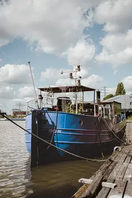 Ihr Stil schwingt völlig eigensinnig zwischen all diesen Vergleichen, sie geht autark durch die Kulturgeschichte und nimmt extrem wissensdurstig alles auf, was ihr gefällt. Nicht überraschend sind das häufig Frauenfiguren. Mit ihrem Partner Nik hat sie sich ihre gemeinsame Welt gestaltet: Schnell weg aus der Heimat Bayern, bloß nicht nach Berlin, die Liebe zum Wasser zog beide nach Hamburg. Den gläsernen Pavillon auf dem Achterdeck haben sie gemeinsam entworfen und gebaut, nachdem sie den Wattsegler vor knapp vier Jahren zum Spottpreis, aber – momentan noch wichtiger – inklusive Liegeplatz erwarben und wortwörtlich von Grund auf renovierten. Auf Kiel gelegt wurde der Motor-Frachter mit zwei kleinen Hilfssegeln 1906, war danach im Einsatz zum Transport von Äpfeln aus dem Alten Land in den Hamburger Hafen.