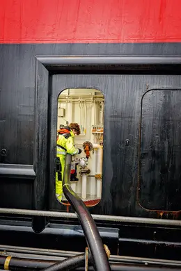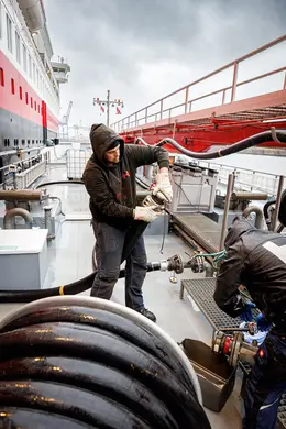 Wir fahren weiter zum Bunkerkunden „Finnmarken“, eins der Postschiffe der Reederei Hurtigruten. Bereits seit 1893 verbinden deren Schiffe den Süden mit dem Norden, brachten einst Post sowie Waren nach Norwegen und luden diese entlang der Küste ab. Heute transportieren die Schiffe vor allem Reisende, die die Fjorde kennenlernen wollen. Zum Betanken des großen Schiffs wechseln wir auf das Bunkerboot „14“, modern, da von 2015, mit Platz für 480.000 Liter Diesel. Das Betanken dauert hier zwei Stunden. Krischan hat nun Zeit, beißt in mitgebrachte Chicken McNuggets und sagt: „Was Schöneres als den Job kann ich mir nicht vorstellen. Hier bin ich mein eigener Herr, halte Klönschnack mit Kollegen. Außerdem ist es ein geiles Gefühl, sich hier mal ein bisschen wichtig zu fühlen.“